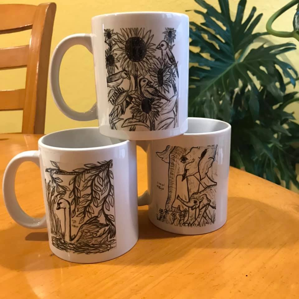 Click here to write me. From the Marvelous Mugs Collection: Swan of Serenity, Sparrows and Sunflowers, and The Never Forget Mug